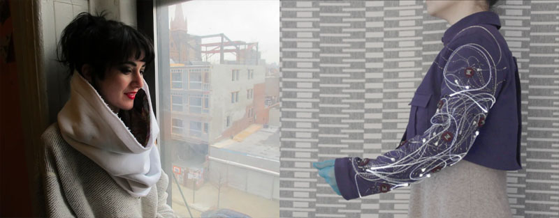 Sonic sound scarf by Stephanie Mars, and fiber optics AI jacket by Mika Satomi: