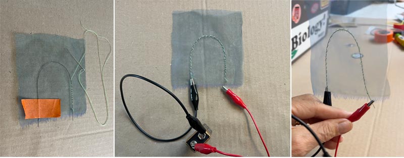 The shape memory alloy did not respond and bend it's shape. Perhaps the wire is expired. I'm calling this a "fail" that I hope to learn more from at some point. I decided to move on, though I was fantasizing trying out a mini version of Jie Qi's animated vines! Here are some photos of the construction, but I'm not including a video (trust me, nothing happened!). This silver lining is that we were able to use the heating wire (it got hot!) to test out the thermochromic swatches. :)