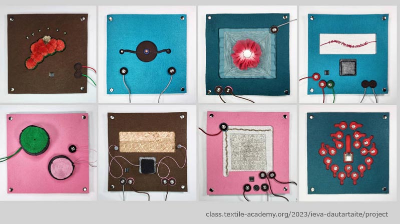 Ieva Dautartaite created this swatch library as an educational resource — a kit of electronic textile sensors for mobile FabLabs. A swatch library like this could be great way to start off the wearables unit, and an excellent addition to the TextileLab!