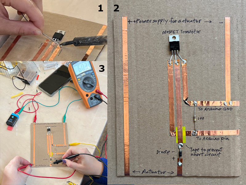 Setting up a transistor circuit will prepare us to use actuators that need more current than the Arduino and/or Xiao pins can provide. To manage higher power sources (like a 9V battery), Jessica Stanley showed us how to construct a transistor driver circuit. Transistors act like a gate allowing behavior changes based on the voltage applied to one pin. This driver circuit allows us to try out systems that require higher power sources, such as to produce heat, sound, and movement.