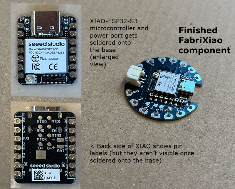 We soldered the XIAO-EXP32-S3 microcontroller and power port onto the base of the FabriXiao board. This creates a component that is sewable and easy to prototype soft circuit swatches with.