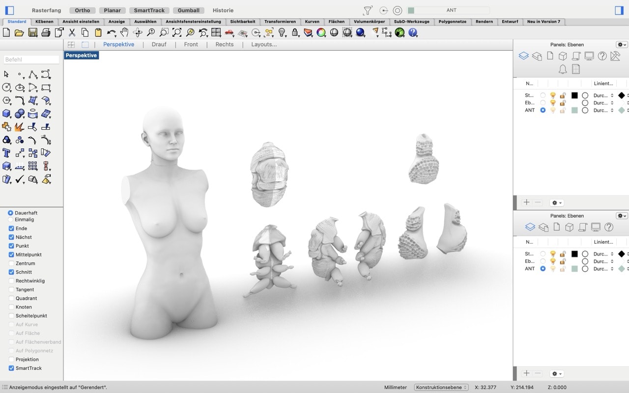 I'm already very familiar with Rhino, so I felt more confident using it. I scaled the individual parts there and explored various tools for working with meshes, solid bodies, and SubD models.