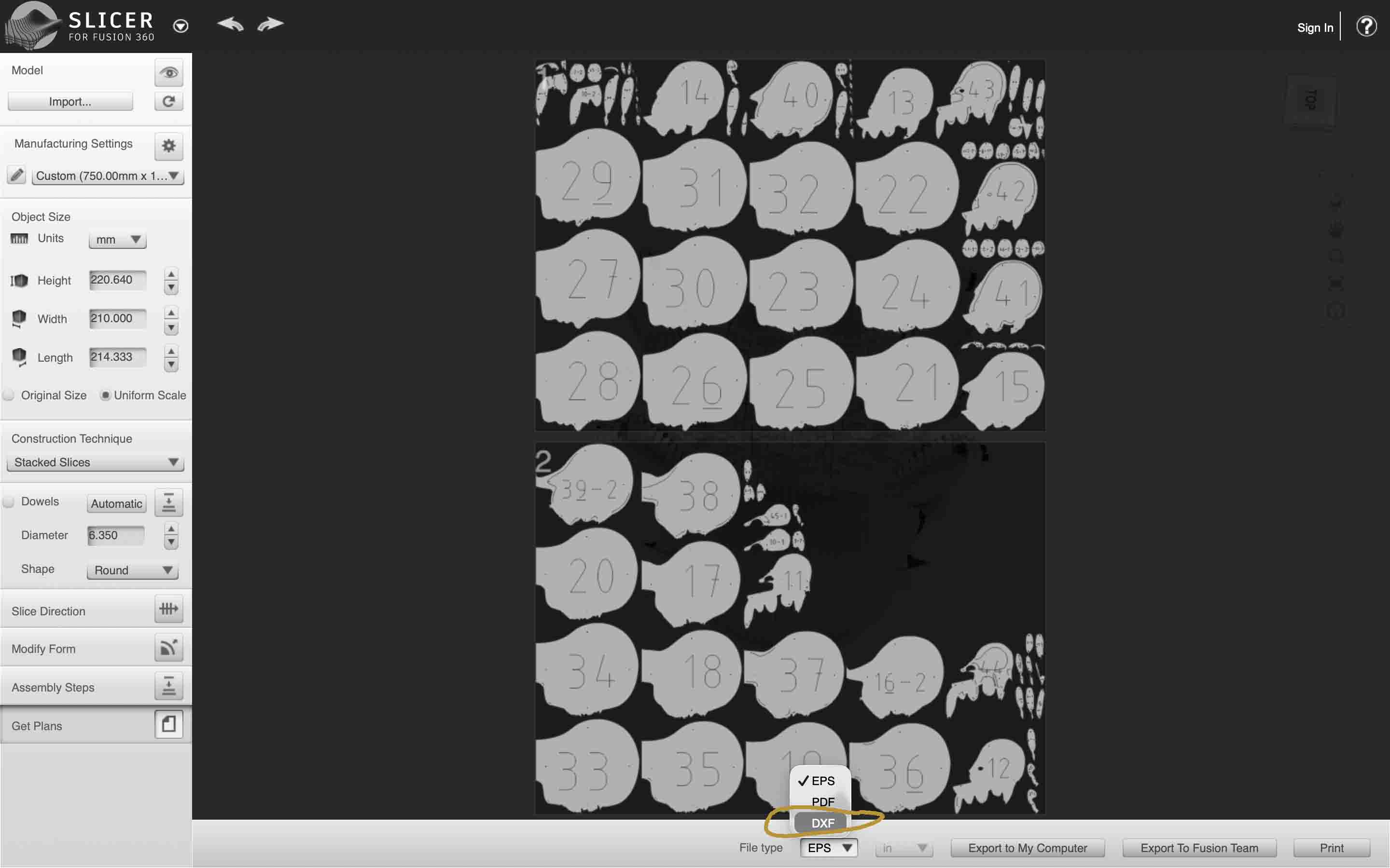 To convert my 3D model into flat, buildable pieces, I used the software Slicer for Fusion 360.