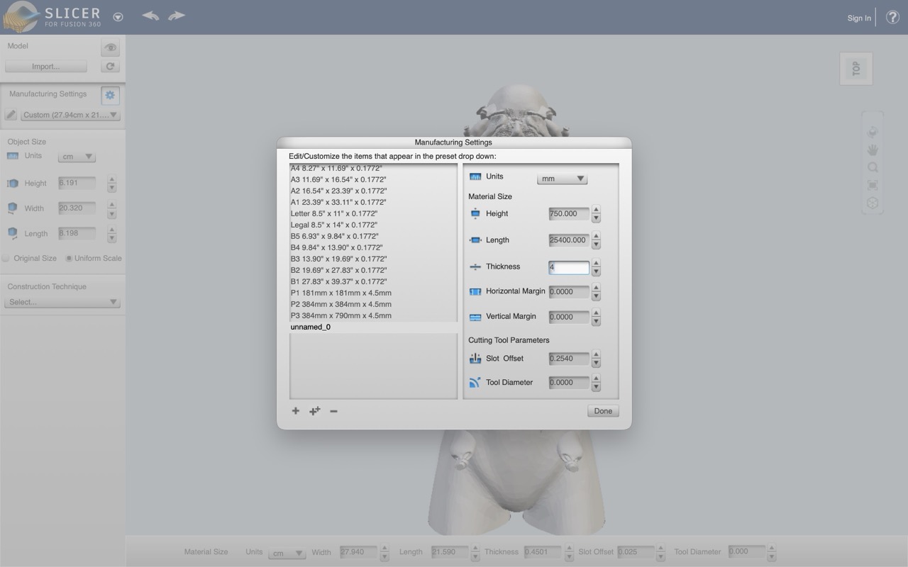 After importing the STL file into Slicer for Fusion 360, I configured the sheet layout for export. I then created a custom material profile, adjusting the dimensions to match the laser cutter material specifications.
