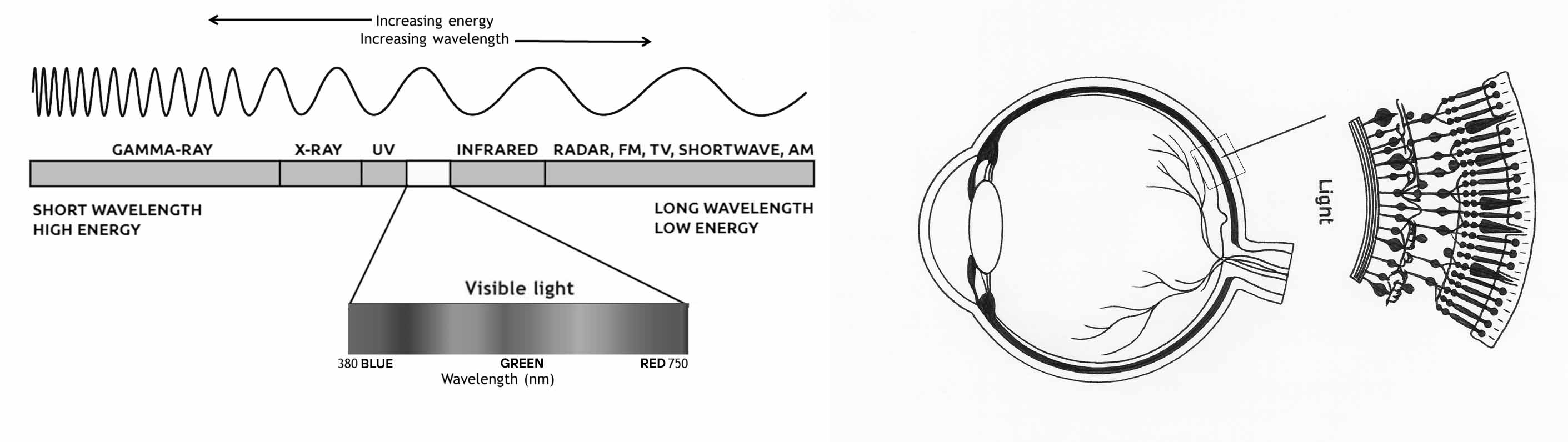 to break it down: Inside our eyes, we have rods & cones. When light enters through the iris, it hits the back of the eye, where the light rays are processed. The rods help us see light & dark, while the cones are responsible for detecting red, green & blue wavelengths. When all 3 types of cones are activated, we perceive brightness. When none are activated, we see darkness. Our visible spectrum lies between ultraviolet & infrared light. We can perceive wavelengths from red to blue — red has the longest, slowest waves, blue has the shortest, fastest ones. Green lies right in the middle.