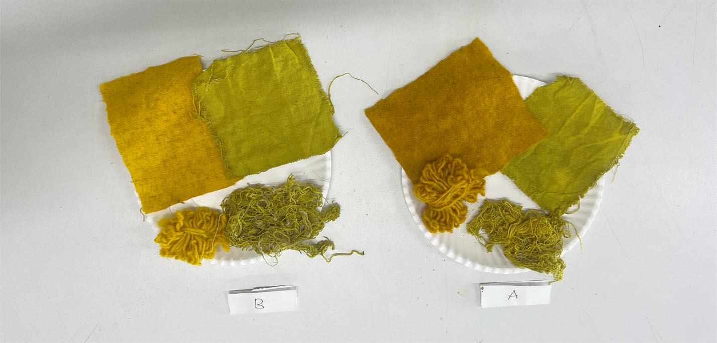 Since the colour results from both dye baths (A & B) turned out surprisingly similar,I decided to place the textiles samples from Bath B into a vinegar modifier bath. The goal was to brighten & clarify the tones — achieving a slightly clearer, more luminous yellow hue.