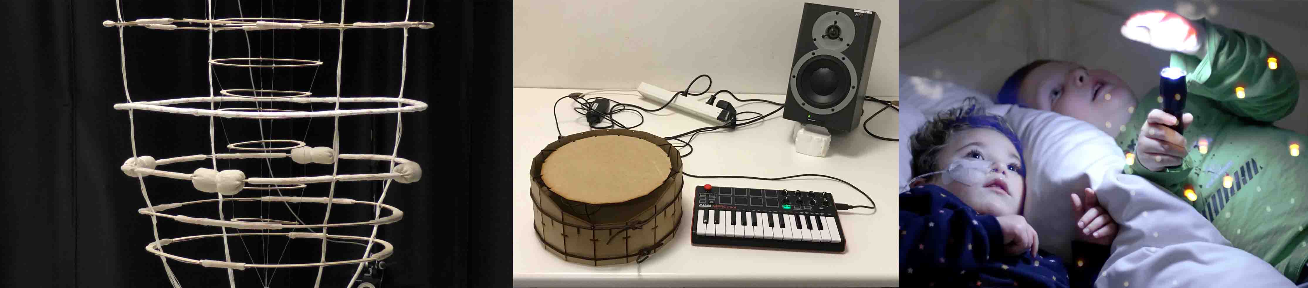 Suspended Circles Interactive hanging mobile with knitted sensors, Trill Craft and Bela