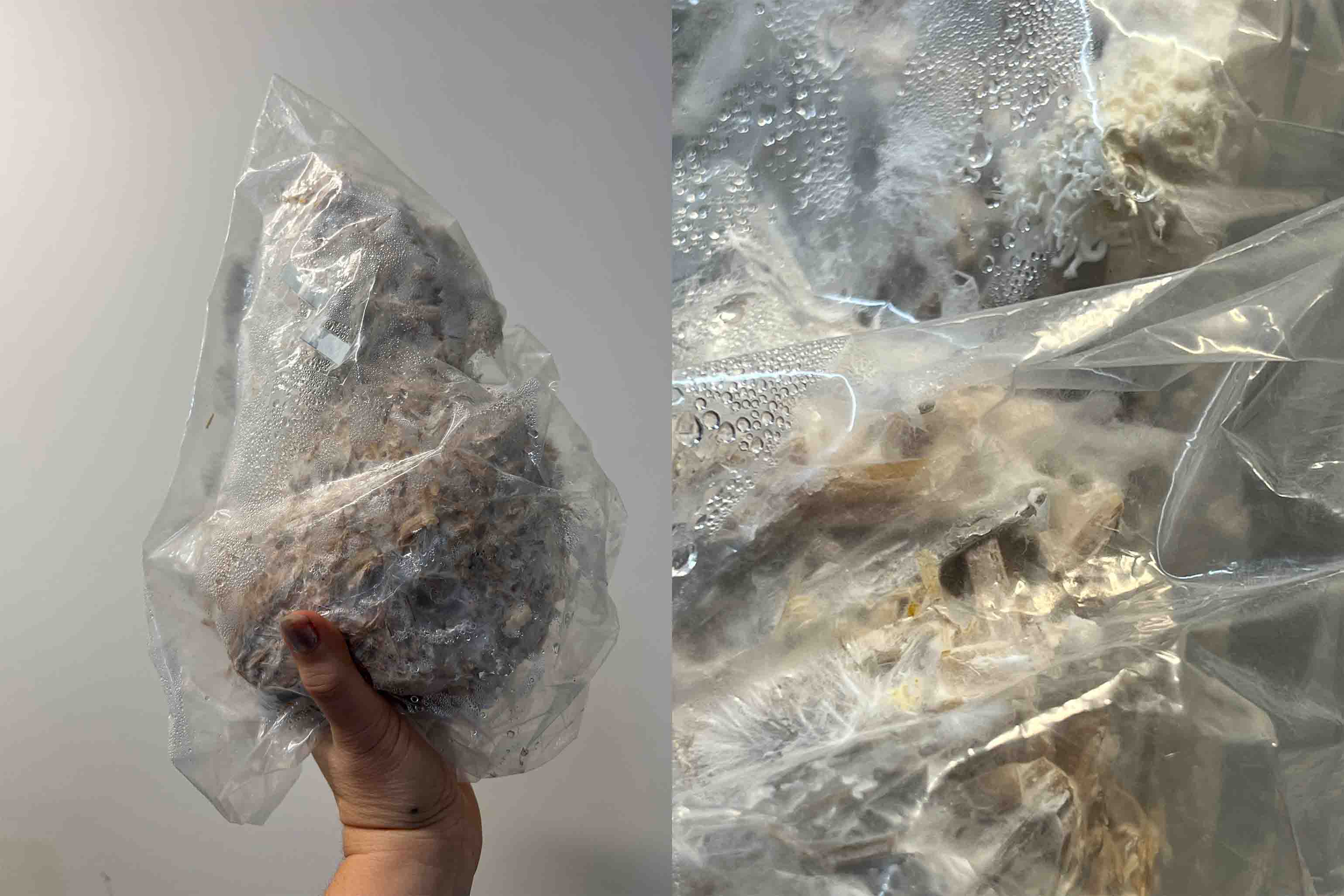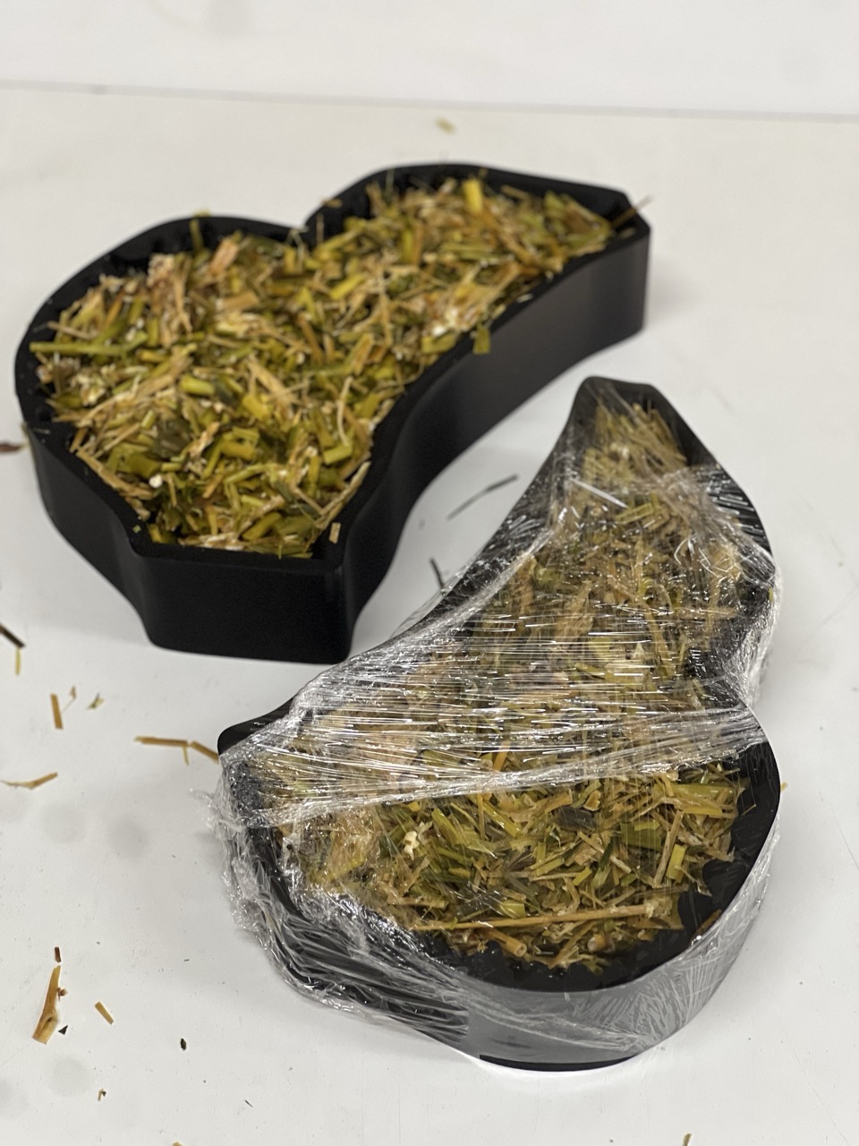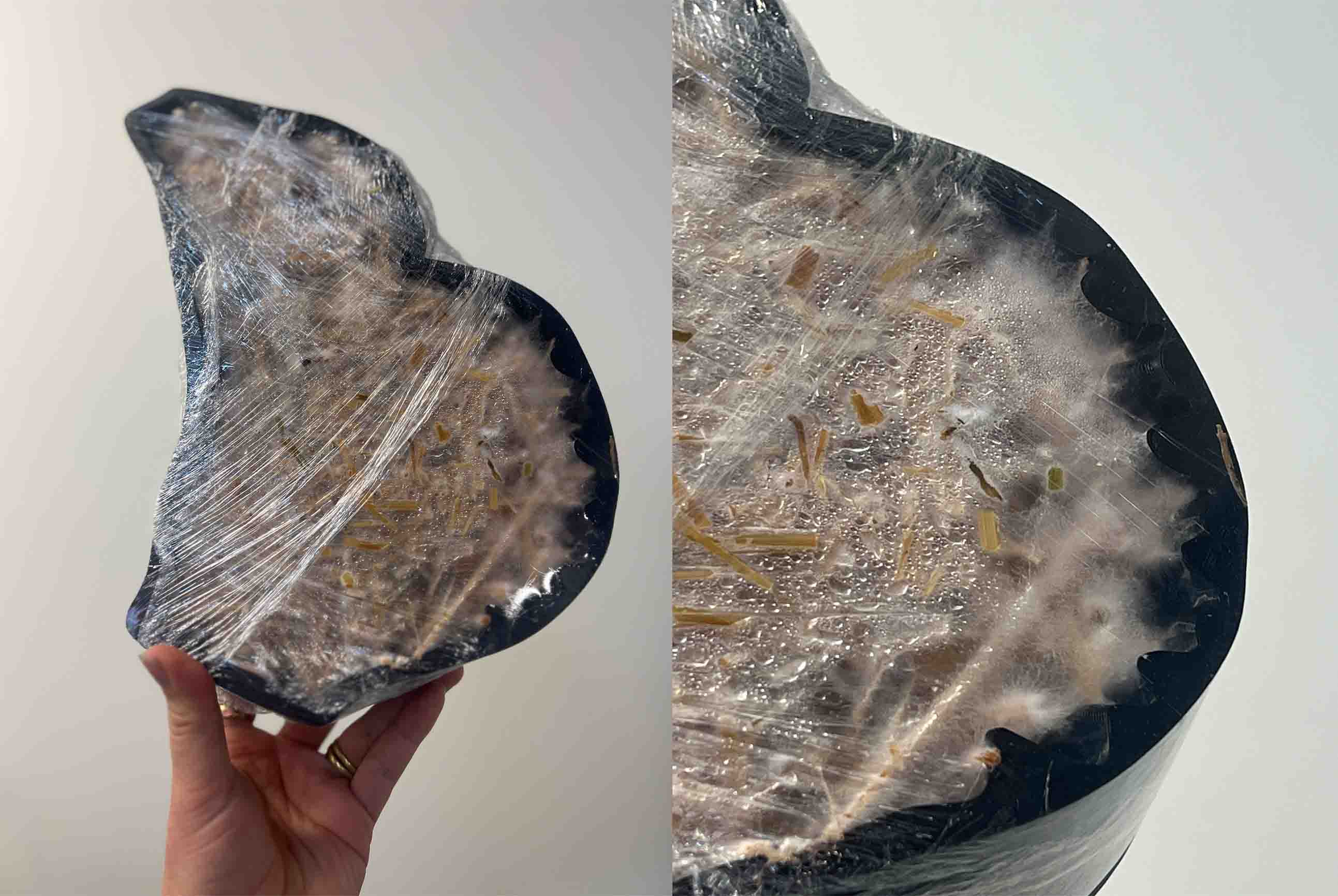 Fill the Mold Fill each half of the 3D-printed mold separately. Cover loosely (plastic wrap or lid with small holes / micropore tape) to allow gas exchange. Do not seal airtight — the mycelium needs oxygen.