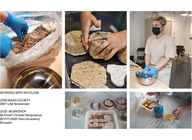- Growing: Cultivating living systems — such as mycelium, kombucha, or algae — into material form.