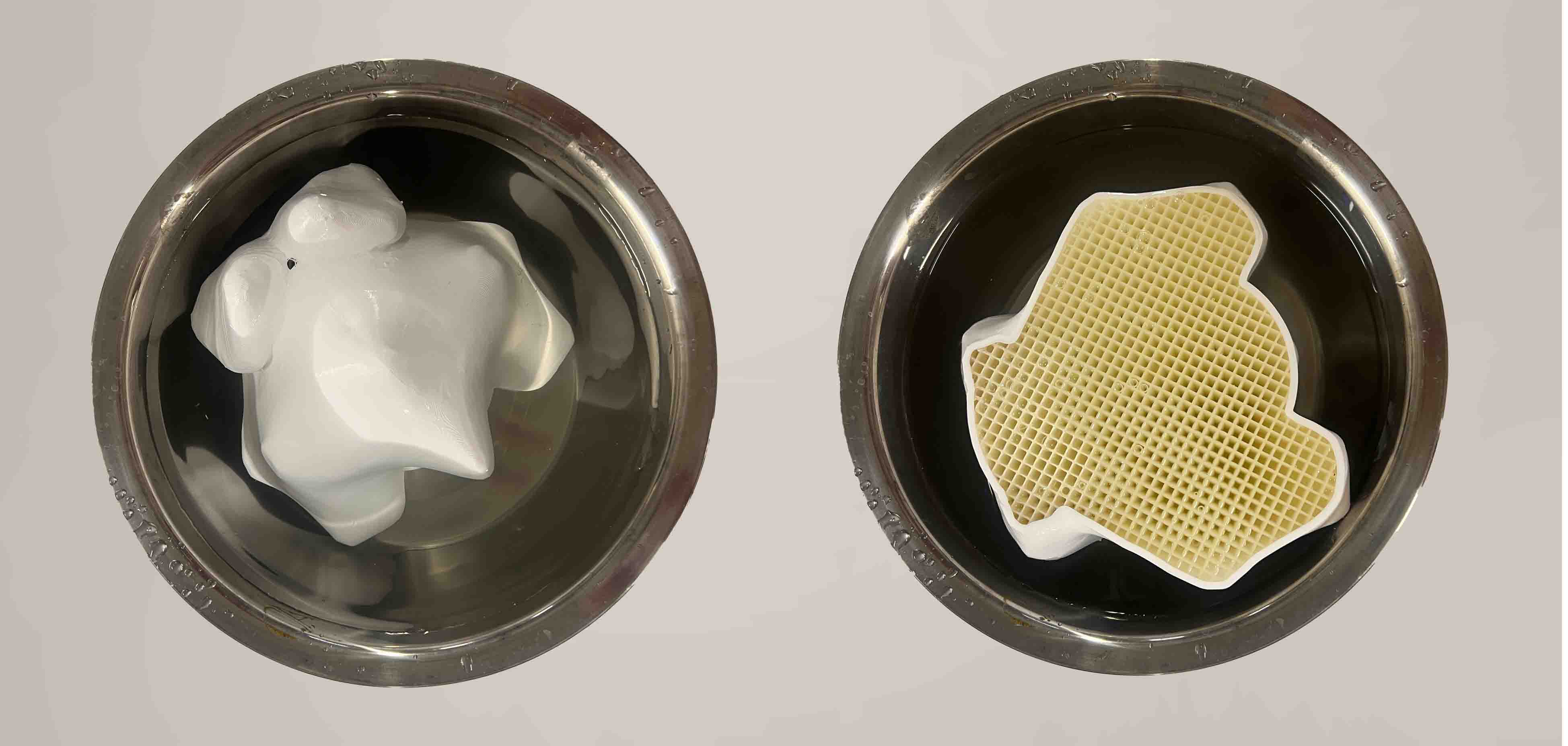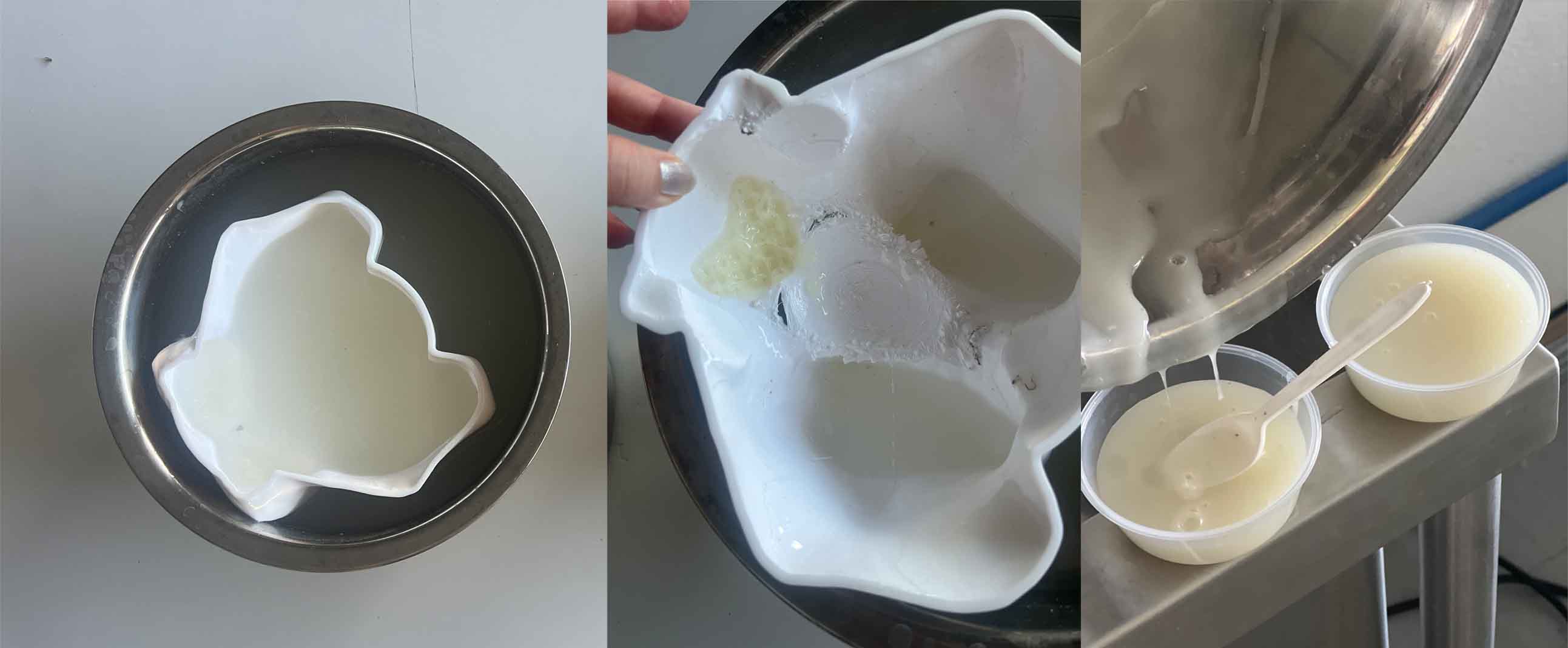Although undercuts still pose a challenge during demolding, I decided to take the risk. From previous experiments, I know that gelatin-based bioplastics — whether used as a rigid, flexible, or foamed material (with - without glycerin - with added soap) — remain flexible enough immediately after curing to be removed from molds with undercuts without breaking or tearing.