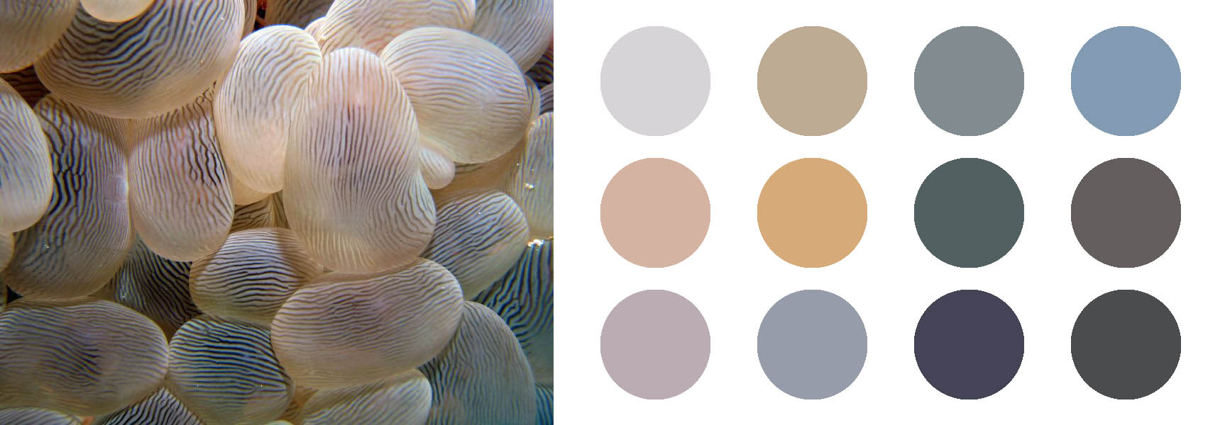 The lighting design is inspired by the original colors of real sea anemones: a soft, organic color palette based on beige, cream, rose, anthracite, & dove blue.