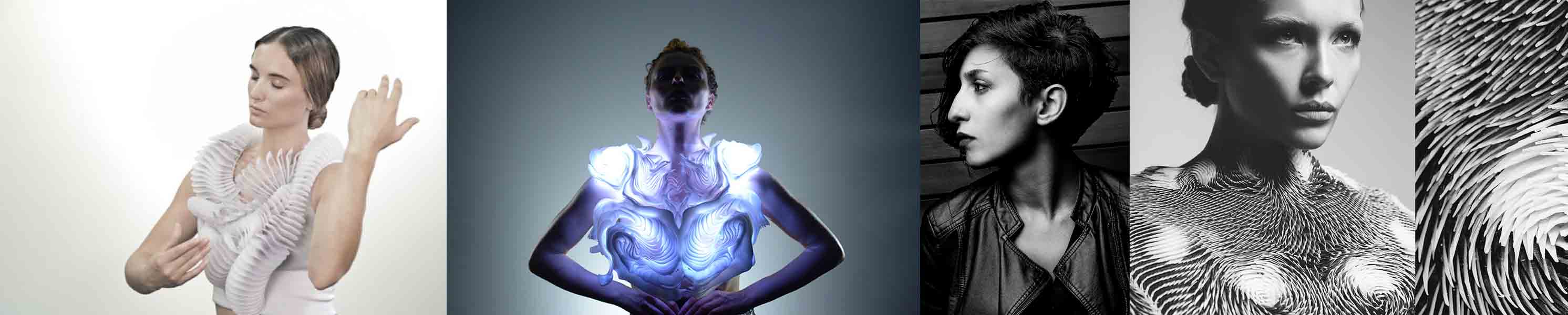 Behnaz Farahi is an Iranian-American architect & designer known for her interactive wearable technologies. such as a 3D-printed garment that responds to the viewer’s gaze by opening & closing its surface — exploring the relationship between technology, perception, & the body.