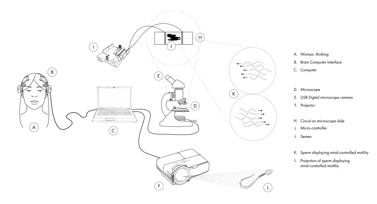Mind Controlled Spermatozoa is an artwork in which Ani Liu uses a brain–computer interface to influence the movement of human sperm cells via electrical fields. By linking EEG signals with galvanotaxis, the project turns mental focus into a direct form of biological control.