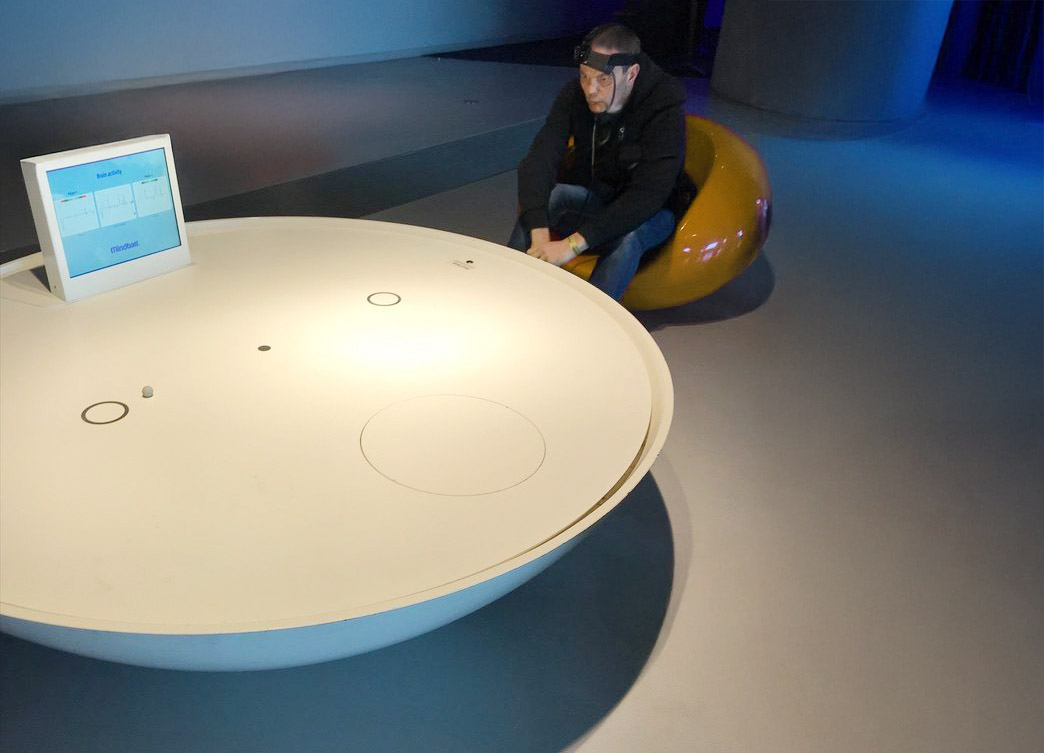Mindgame – Move a ball only with your thoughts Mindgame is an interactive exhibit at phaeno Wolfsburg Germany, where visitors can move a small ball using only their mental concentration. Instead of physical contact, the system uses simple brainwave sensors that detect levels of focus, relaxation, or attention. These signals are translated into motion, so the ball begins to move whenever your mind is calm & concentrated enough.