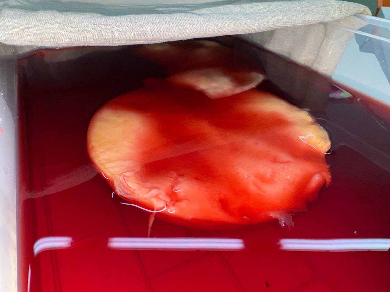 Take water, beer, and sugar, mix them, and put the mixture on low heat. Warm it up to around 80°C and then turn off the fire (we boiled it, which was still okay, but it’s better not to boil the liquid). Let it cool down a little and then add the vinegar. Remove the beer foam and leave it to cool until about 24°C. After that, add the cleaned SCOBY, close the container with a clean fabric, and place it in a dark and warm room for several weeks (about 10 weeks in Armenia, and less in warmer climates like Mexico).