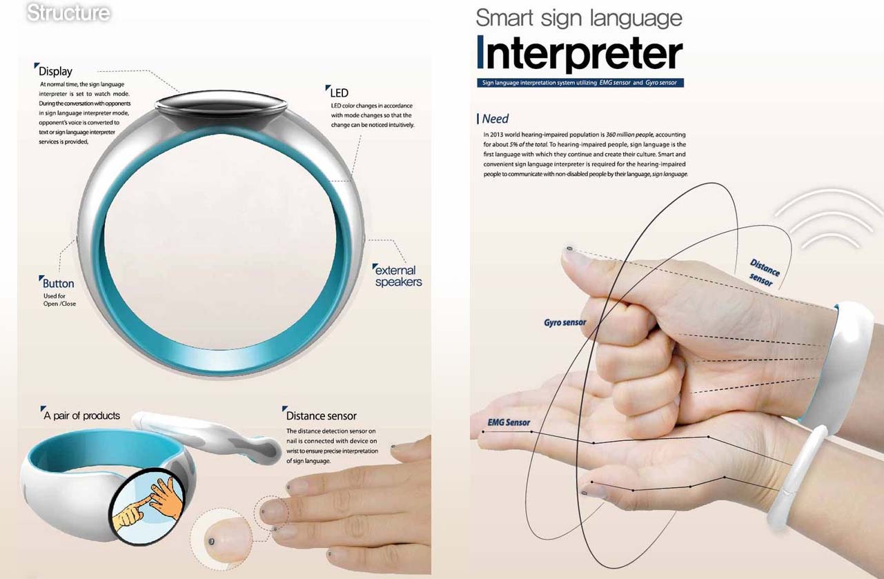 Small distance sensors are applied to the tips of the user’s fingernails. When a hearing-impaired person uses signs to communicate to a non-hearing-impaired person (who can not use sign language), the signs are tracked, converted into voice or text data, and sent to the recipient’s smartphone. The device also contains speakers that can transmit the voice data directly. When a non-hearing-impaired person speaks to a hearing-impaired person, their voice is converted into text by the device, and displayed on its built-in screen. The text can be converted into signing diagrams.