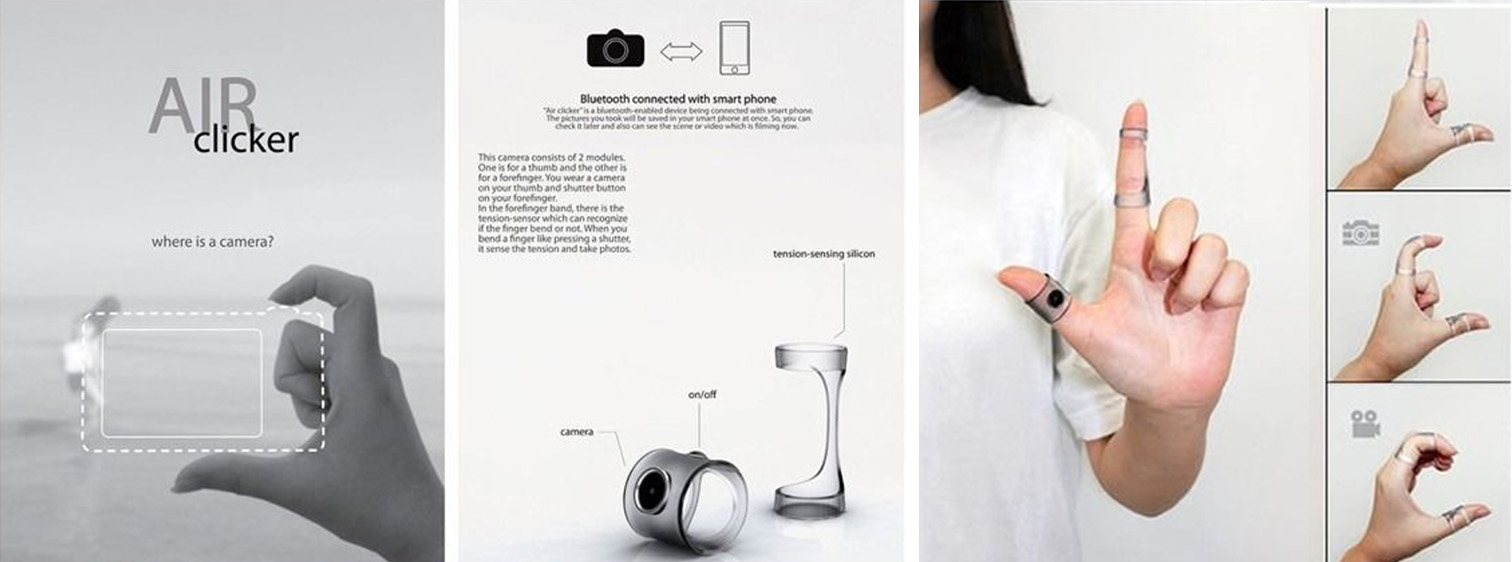 The idea is a super-easy construction — the Air Clicker Bluetooth camera concept by Yeon Su Kim. This device is made from just two silicone rings worn on your fingers. It is already on your hand, and you can take a photo immediately without losing special and important moments.