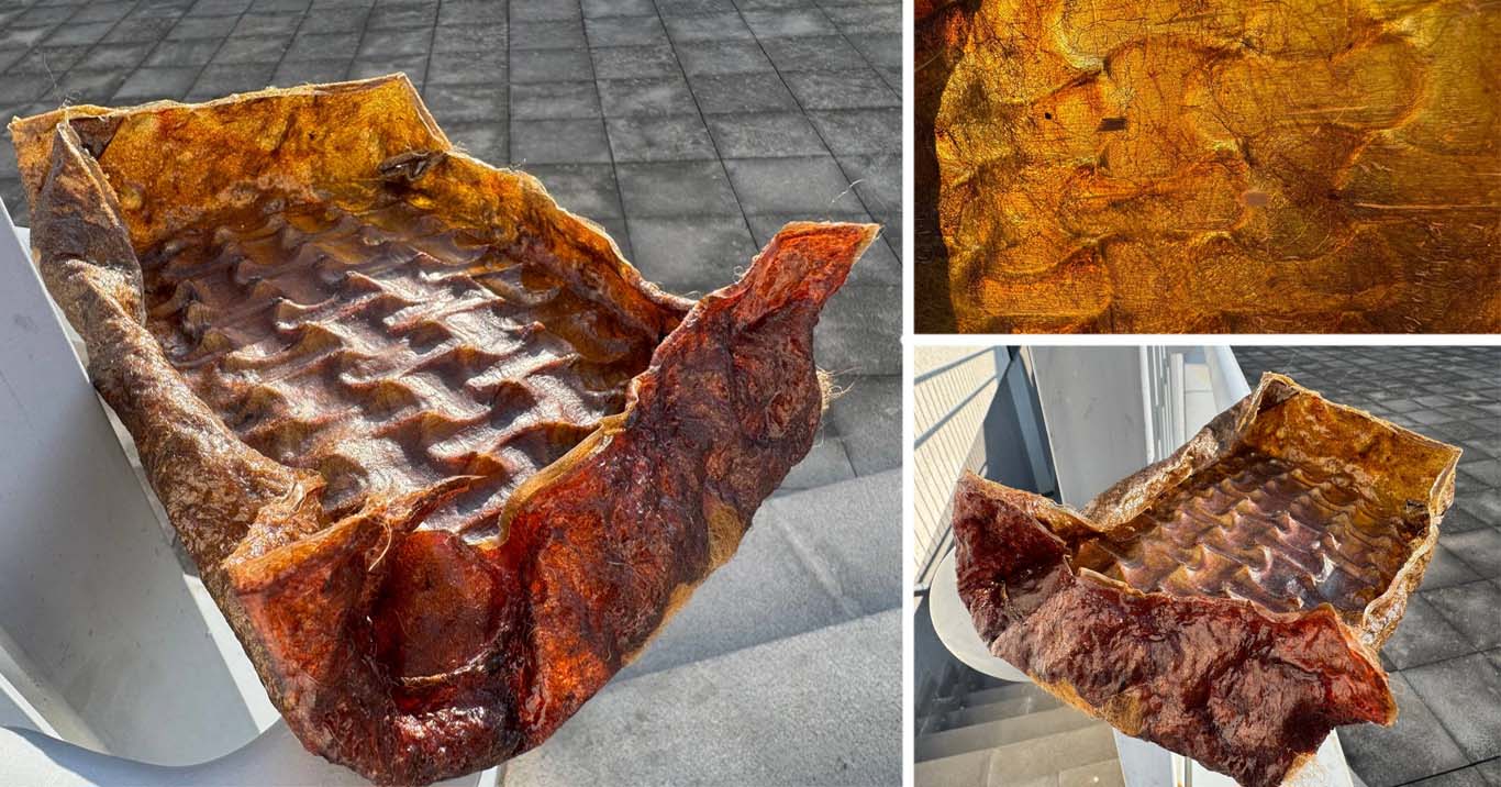 Svetlana made a recipe with wool, but not with gelatin. I noticed that material became more stable, more like a fabricated form, soft, and it could keep its movement. This time, I was interested in making a material with gelatin, and trying to put it inside a mold the next day, so that it would dry inside the mold and keep its shape permanently.