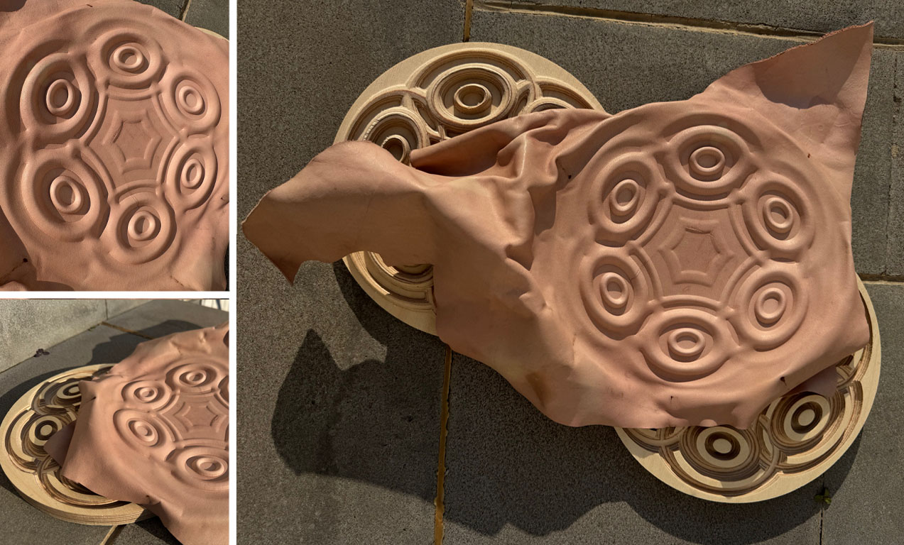 When the leather took its first form, I closed it with the female mold part and pressed both sides together. After that I left it to dry for a few days inside the mold, so the material could keep the shape permanently.