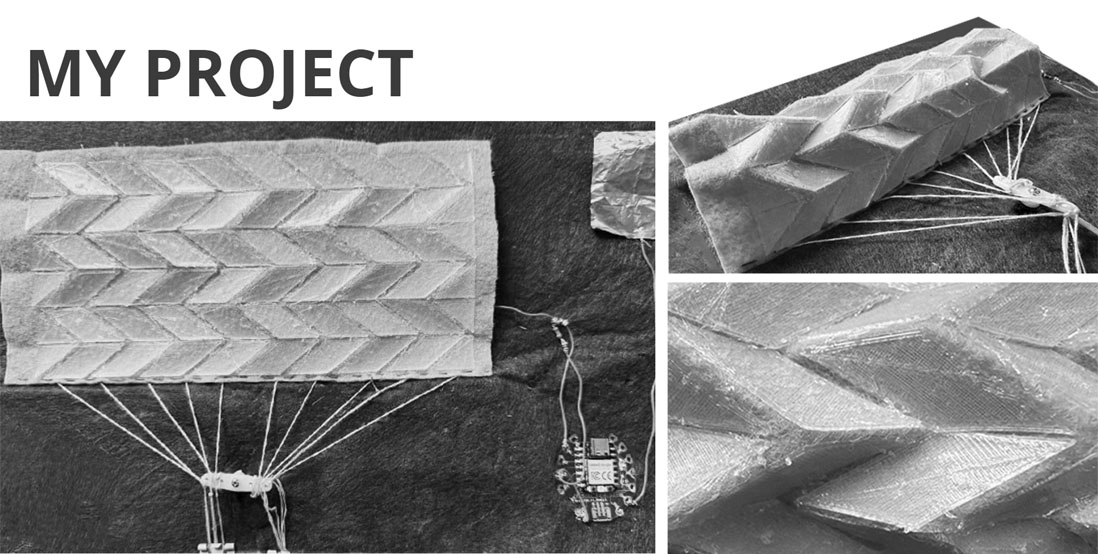 I wanted to create an origami-shaped fabric that would be more stable, strong, and visually interesting, and that could be integrated into different projects — maybe in clothes or in industrial objects, like a sofa, chair, or anything else. I had a small project in Wearables week where I used the 3D-printing-on-fabric method. After that, I put it under a press and got a pattern that moves when the material works.