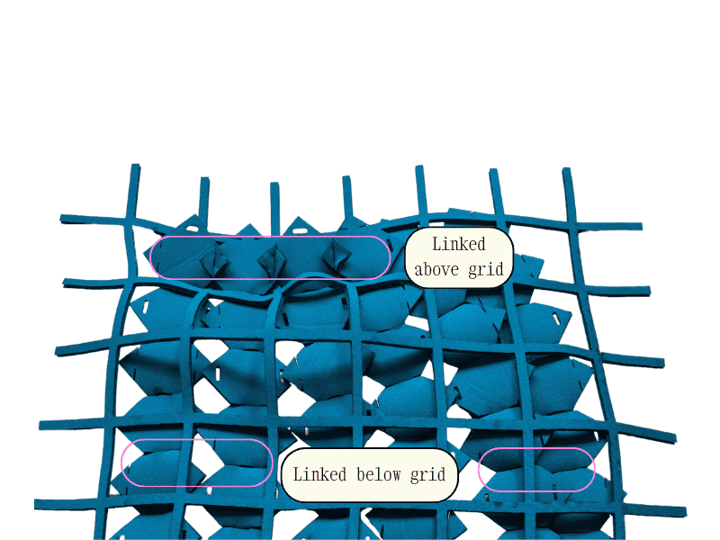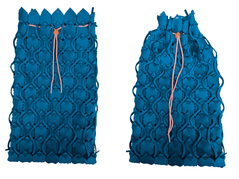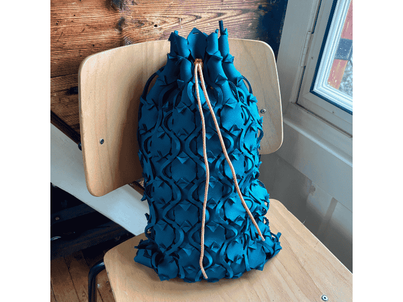 The module can be used to make any garment or textile based on a grid pattern. For a drawstring bag, I laser cut two rectangular panels and interlocked them together at the edges. To “weave” my modules around the grid, I interlocked the modules in front of the grid going in the vertical direction, and behind the grid in the horizontal direction.