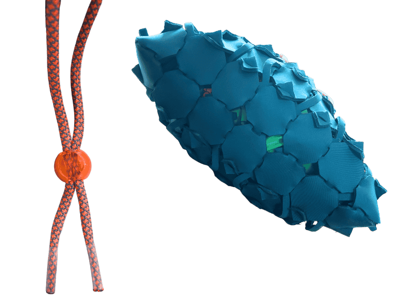 I picked up some cord and cord locks from a local fabric and sewing supply shop and wove it through the top row of modules to get an even fold/scrunch when the drawstring is pulled. I also used heat-shrink tubing to seal the ends of the cord.