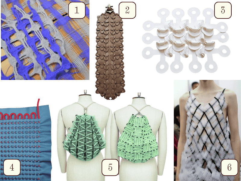 My inspiration this week includes weaving and its role in 3D textile manipulation. I found examples of fashion and textile design that utilize the over-and-under layering of fabric strips or string. Interlocking modules can create intriguing textures and dimensions in a garment or textile.