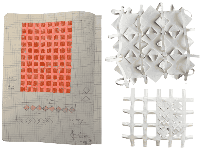 I started with drawing and paper prototypes. The first thing I did was draw how I thought my module would behave. My first paper sample was hand-cut, and I explored ways to interlock squares that would hold a lattice/grid in place.