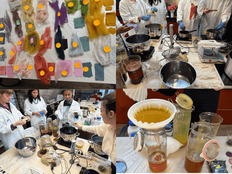 We dyed wool, recycled cotton yarn, silk, and a cotton/viscose blend in the textileLab this week. We started by scouring and mordanting our undyed fibers. We used alum to mordant and scour protein fibers at the same time. We made 3-acetate to mordant our cellulose fibers after scouring. While they processed, we prepared dye baths. We made 16 (16!!!) dye baths with various plant materials and cochineal, which is insect-based. For most baths, we used 150% the weight-of-fiber for a vibrant and concentrated dye. After we had finished dyeing with most dyes, we made lake pigments with the leftovers.