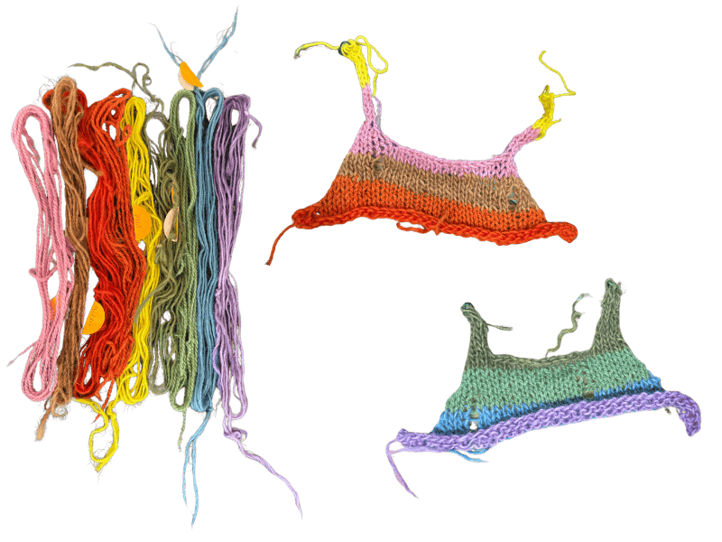 I was able to scour, mordant, and dye some extra material. I made small bundles of 100% wool yarn, each weighing 2 - 3 grams. I dyed them with madder, cochineal, alcanet, coreopsis, coreopsis + iron, weld, weld + indigo, weld + logwood, and indigo. I had enough to knit up a harness/shrug/bolero accessory like my inspiration references. I am working without a pattern for this piece, which is new for me! For an improved fit, I may have to use some secondhand yarn to finsih the hems. But overall, it was very inspiring and exciting to apply this new skillset to my knitting practice. I will update with final images!