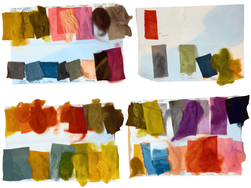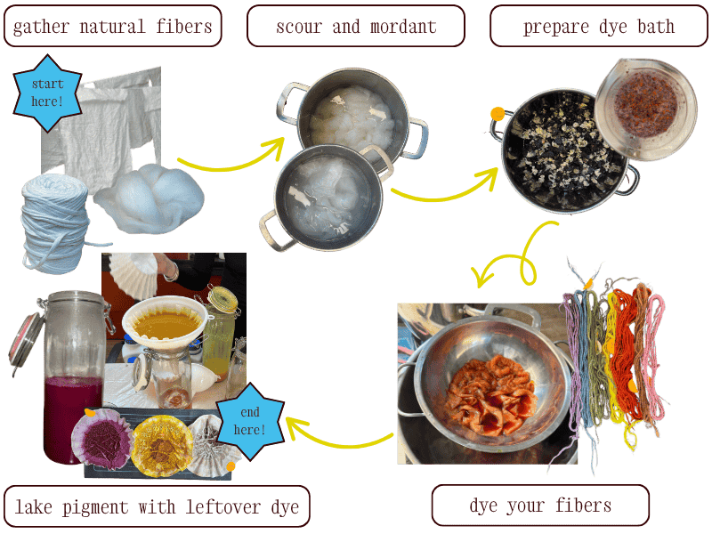Documenting this process in more detail is a collaborative effort. There was a lot happening all at once, and we decided the best way to get a full document was by making a Miro Board1. Our presentation there inlcudes basic steps taken, mordants, dye recipes, and our cumultive results. Everyone conduction the same basic steps, and were more or less dedicated to certain dye baths or processes. Together, we shared any detailed notes on our specific endeavors. Below, I have summarized my experience of this week: