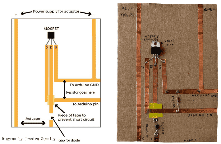 We made a MOSFET driver circuit on cardboard to be able to supply power to out actuators that have a higher power load than the laptop can provide. Making the MOSFET required us to learn how to solder.