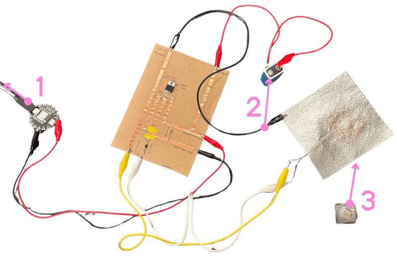 - Alligator clips connect the actuator lines of the MOSFET circuit to the speaker coil. The magnet(s) will be placed under the speaker swatch.