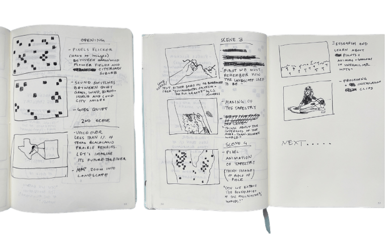 Beginning of storyboard. I am not aiming for a how-to/process/e-textile research video. Instead, I want to focus on the location, mindset, and care for the location. Video will be voiced-over, calm, reflective, and build a sound-scape representative of the restored landscape. Visuals reference the pixelated look of the rug, maps, and processing sketch with the noisy, flickering, and organic nature of a grassland. Combines digital collages/animations with footage of making and interacting with the textile.