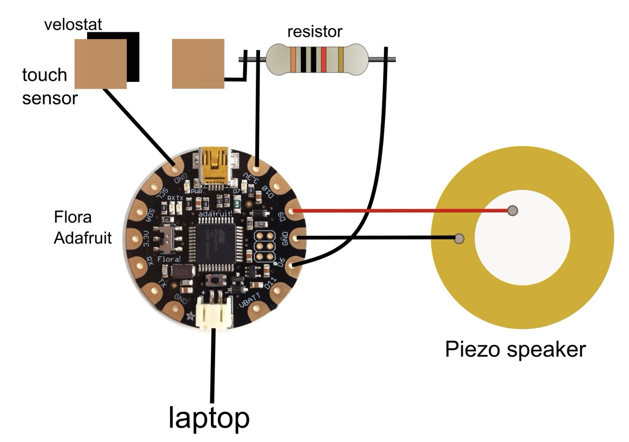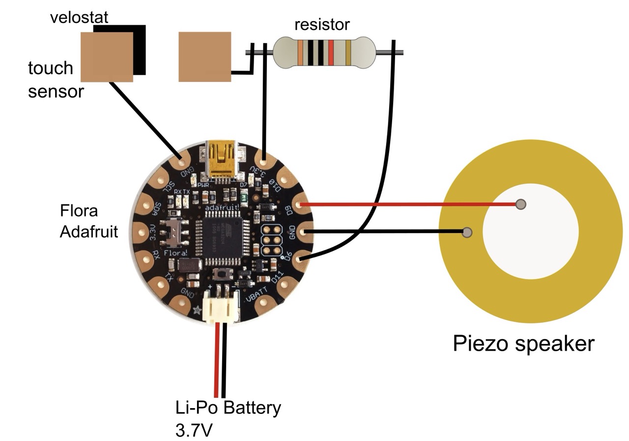 An Adafruit Flora board reads the sensor values using a 5 kΩ resistor and controls a piezo speaker.