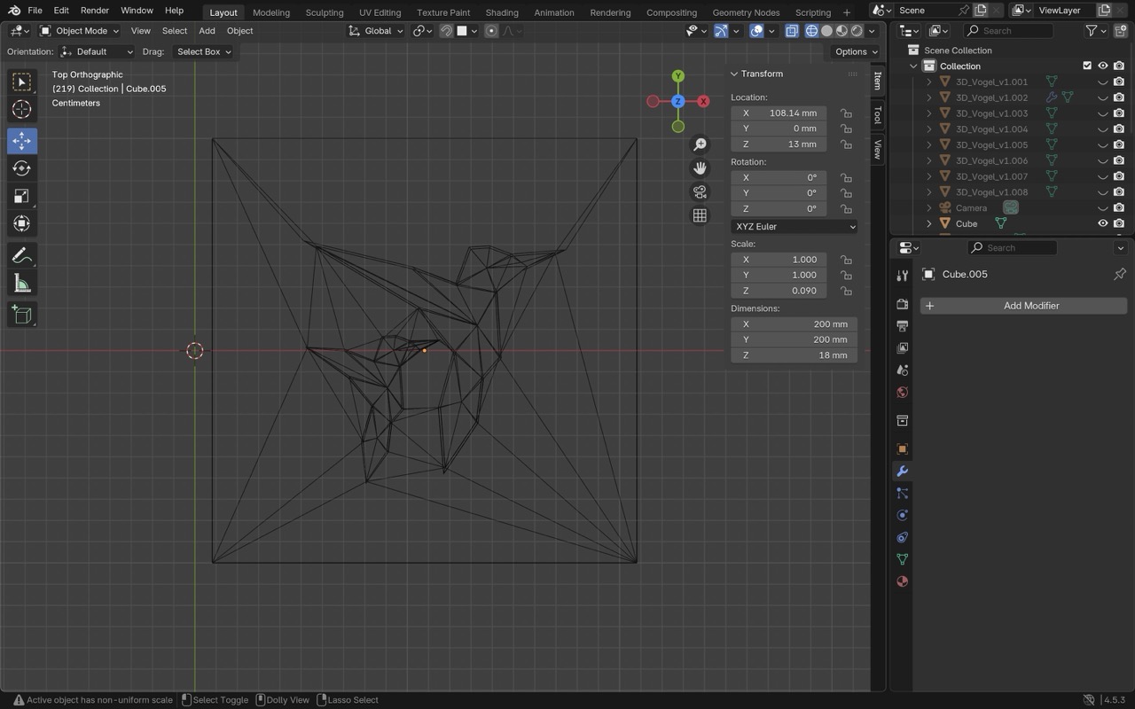 - Went to Item tab → Dimensions: set exactly X: 200 mm, Y: 200 mm, Z: 18 mm