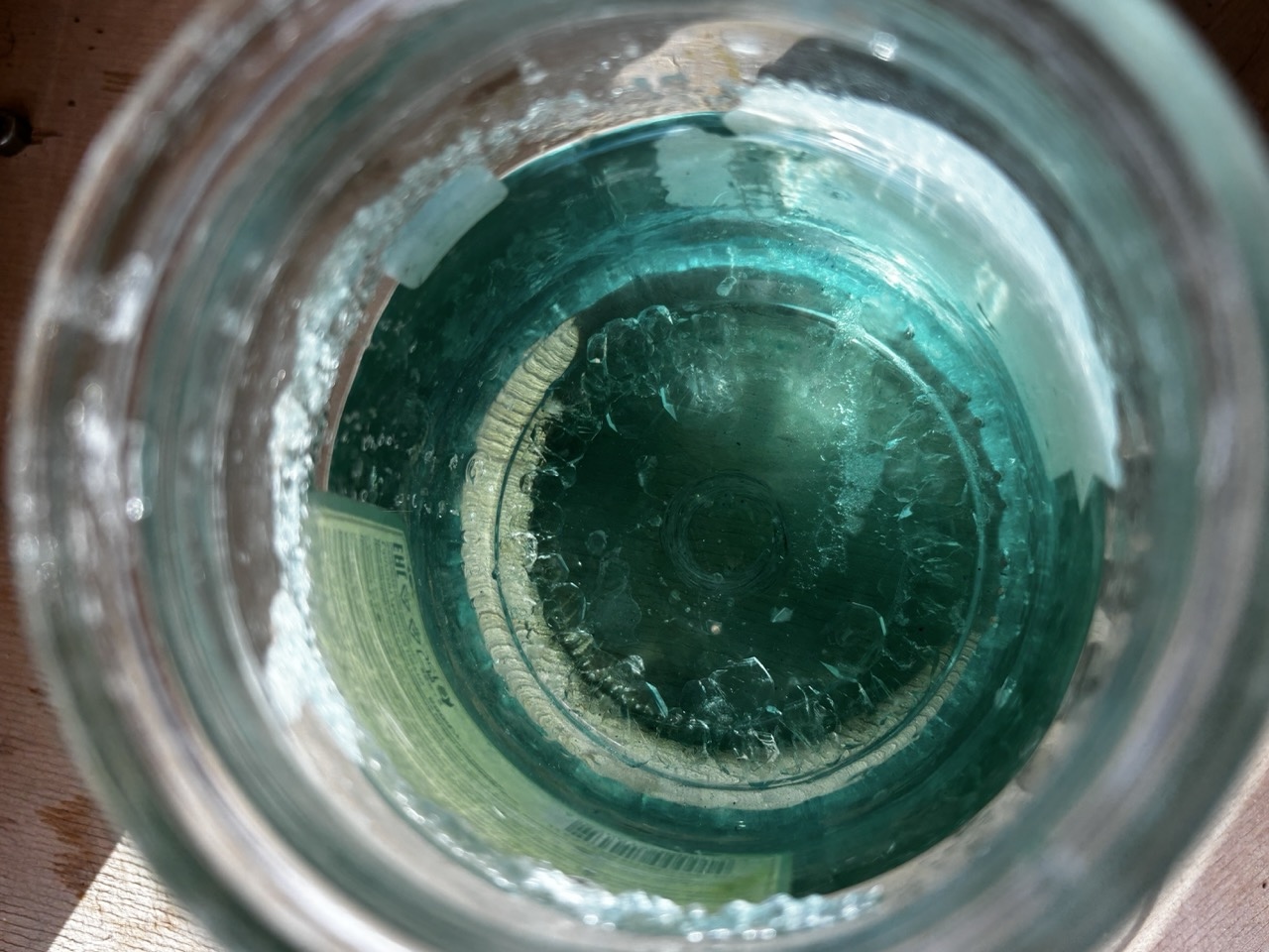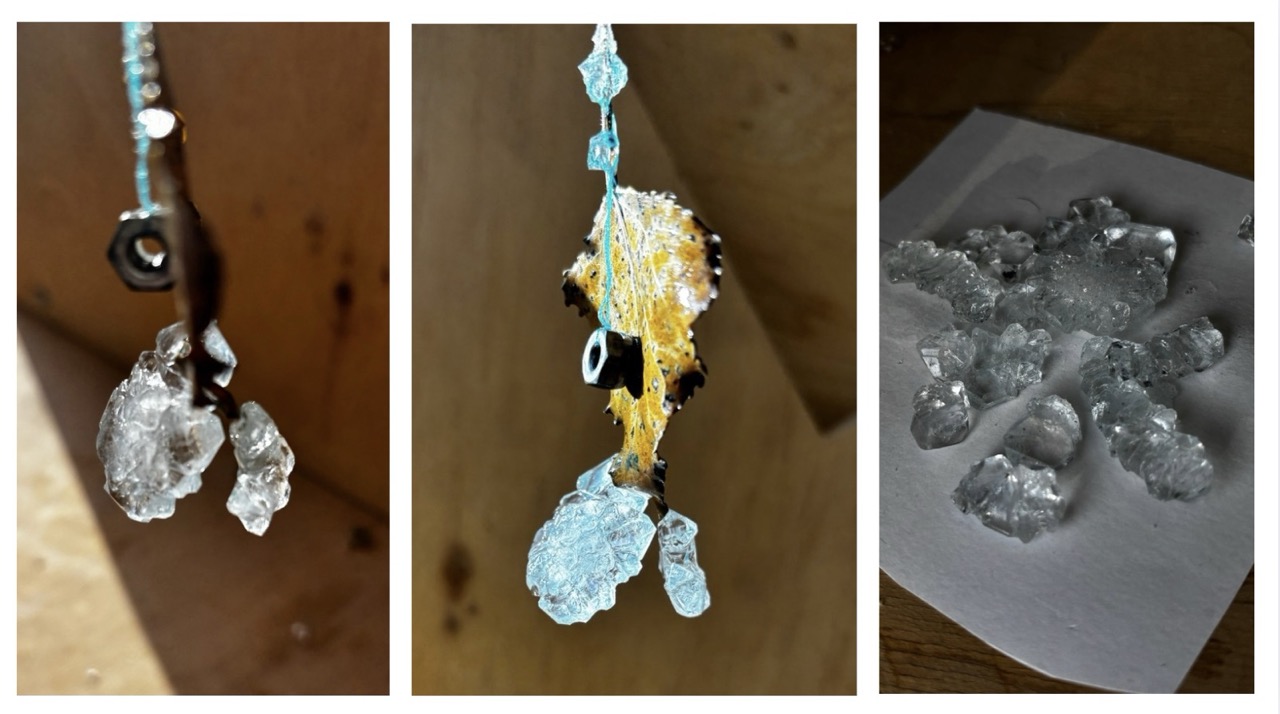When I took it out, I saw that crystals had formed along the edges of the leaf, but not on the nut. The inside of the jar itself was also covered with crystals.