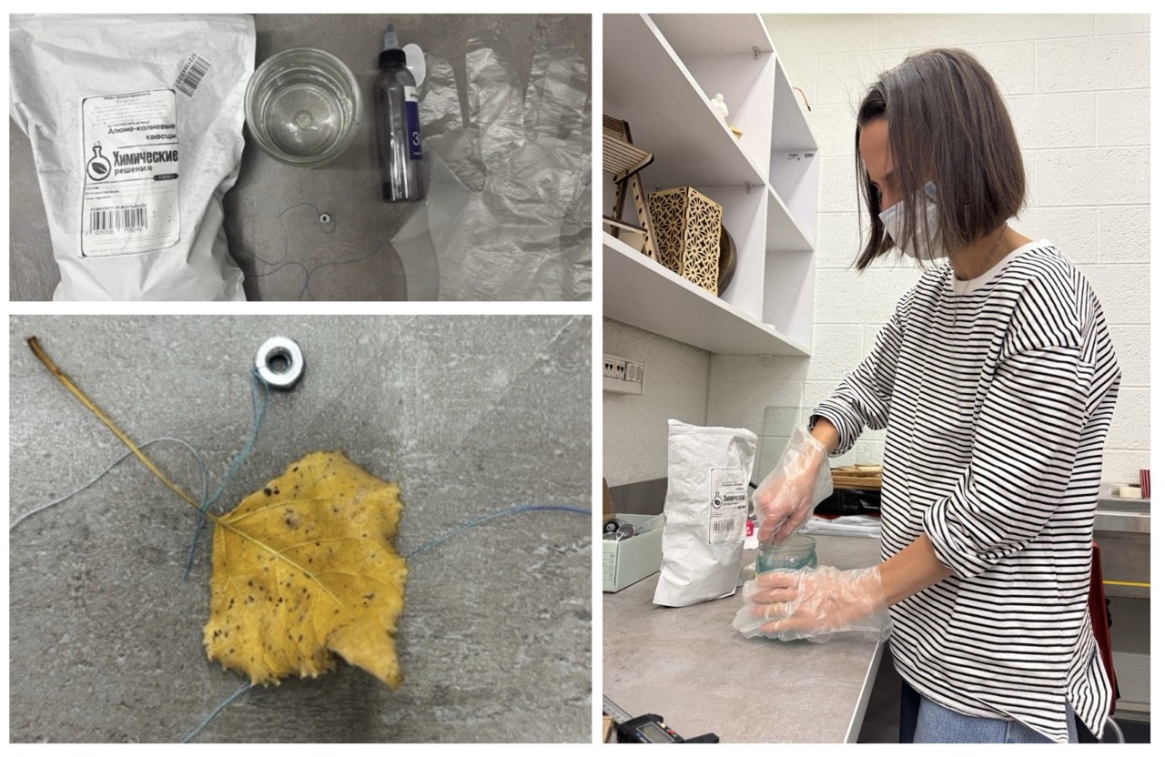 As an experiment, I hung a dry leaf and a metal nut in the solution to act as the base for the future crystals. Then I placed the jar on a far shelf and left it there for a week.