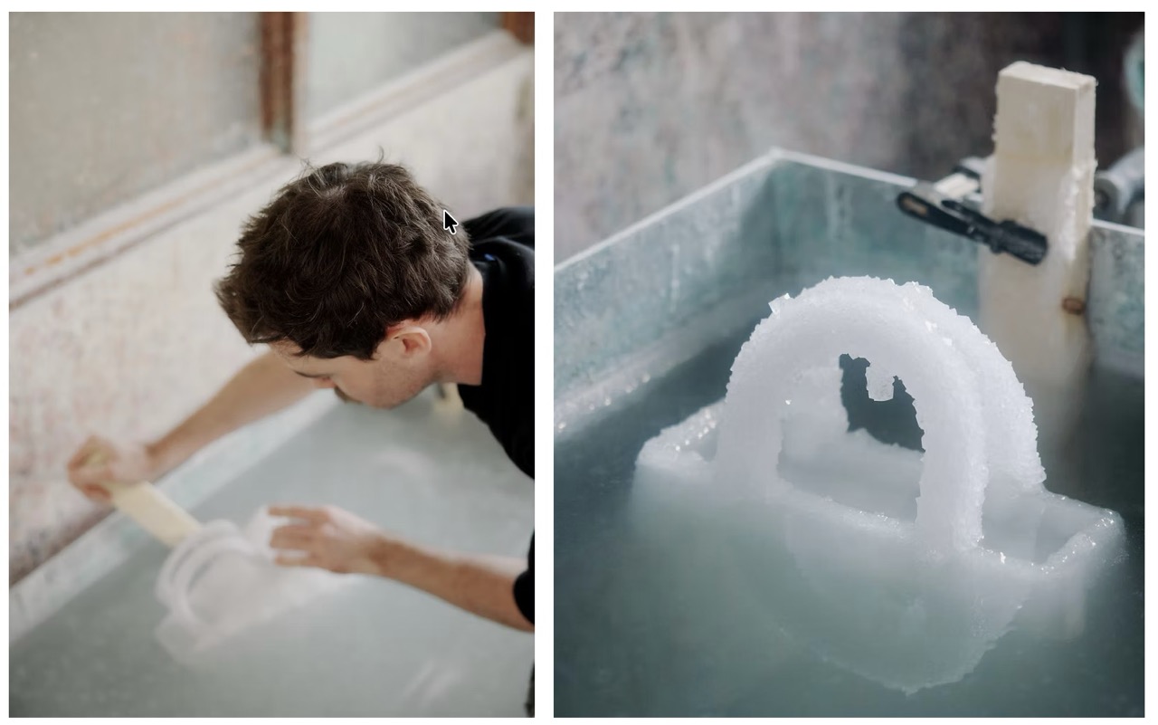 Isaac Monté works with crystallization as a way to let objects change on their own. He grows crystals directly onto existing forms and allows time and chemistry to do the work. In the Crystallized Lady Dior series, crystallization turns a soft, familiar handbag into something solid and mineral-like. The surface thickens, hardens, and slowly takes on a new shape, where color and texture are shaped by the crystals rather than by a designer’s hand.