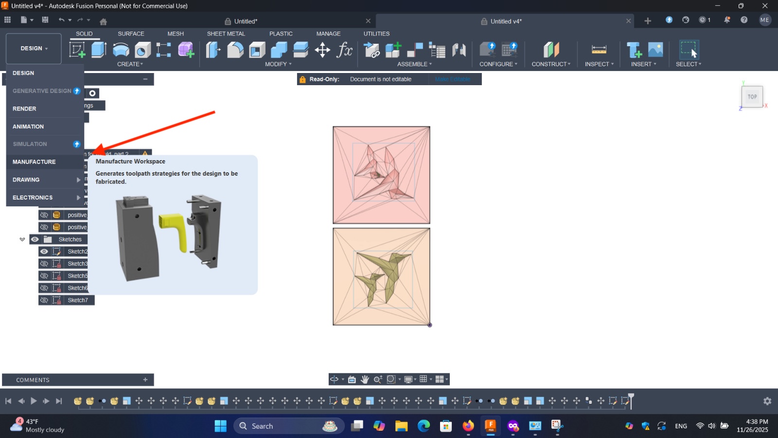 - At the top-left workspace selector, change the workspace from Design to Manufacture.
