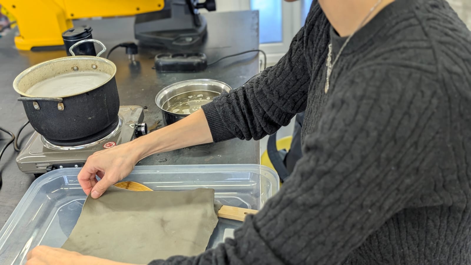 After that, we carefully take the leather out of the water and stretch it over the wooden mold.