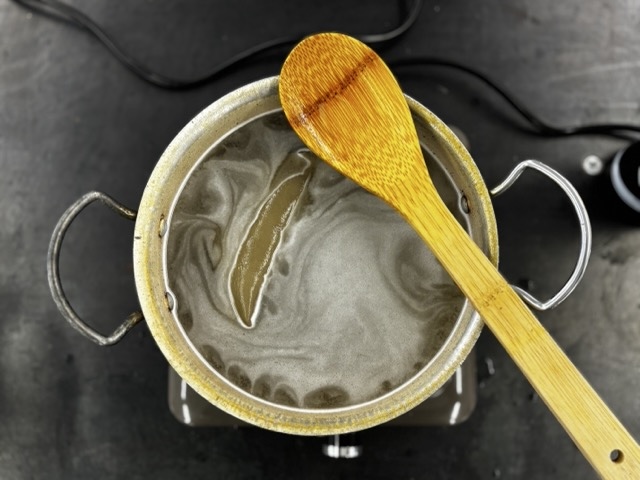 I used potassium alum, adding it to warm water until it stopped dissolving. The solution had to be stirred constantly while I kept adding more alum. For color, I mixed in a small amount of blue dye.