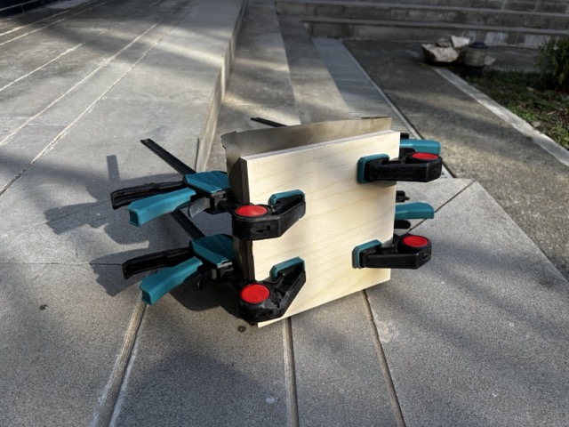 We pull the prepared piece of leather tightly over the mold and secure it from all four sides using clamps. Finally, we let it dry for about 24 hours.