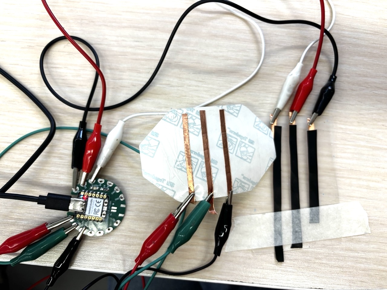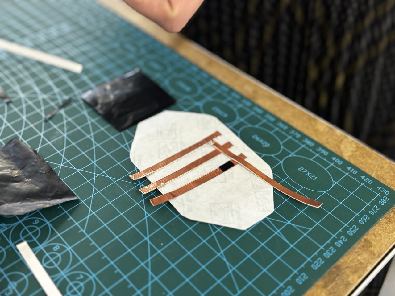 I prepared: - Cooper tape 10cm x 0,5cm - 6 pcs - Tape from Velostat 6cm x 0,7cm - 3 pcs - 3M Tegaderm Transparent Film Dressing - 2 pcs