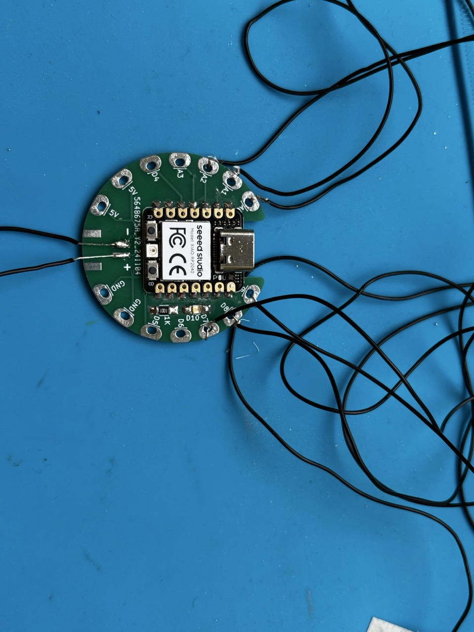 As now we are sure, that the matrix is working well, I soldered Aluminium wires with silicone covering to FabriXiao and connected them to LiPo battery 3.7V.