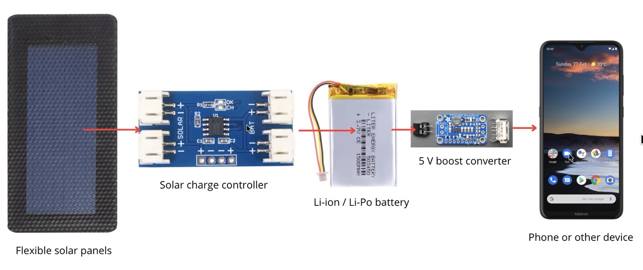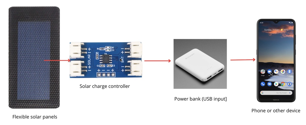 Power Bank: Connect the output of the solar controller to the USB input of the power bank. Choose a bank that accepts charging at lower currents (~100–300 mA) so it will accept solar charge.