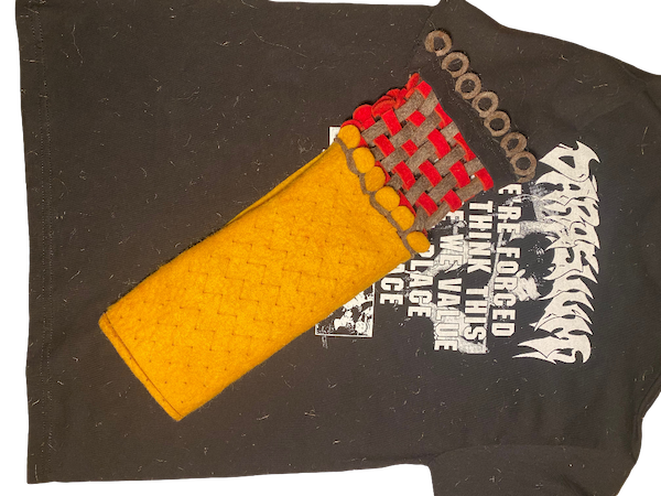Nevertheless, I designed an upper portion of the sleeve which would be a herringbone weave woven with strips of fabric attached to another piece of wool felt that would moreso be folded and shaped into a sort of "puff" on the lower portion of the sleeve (also a herringbone foldable origami tessellation pattern).
