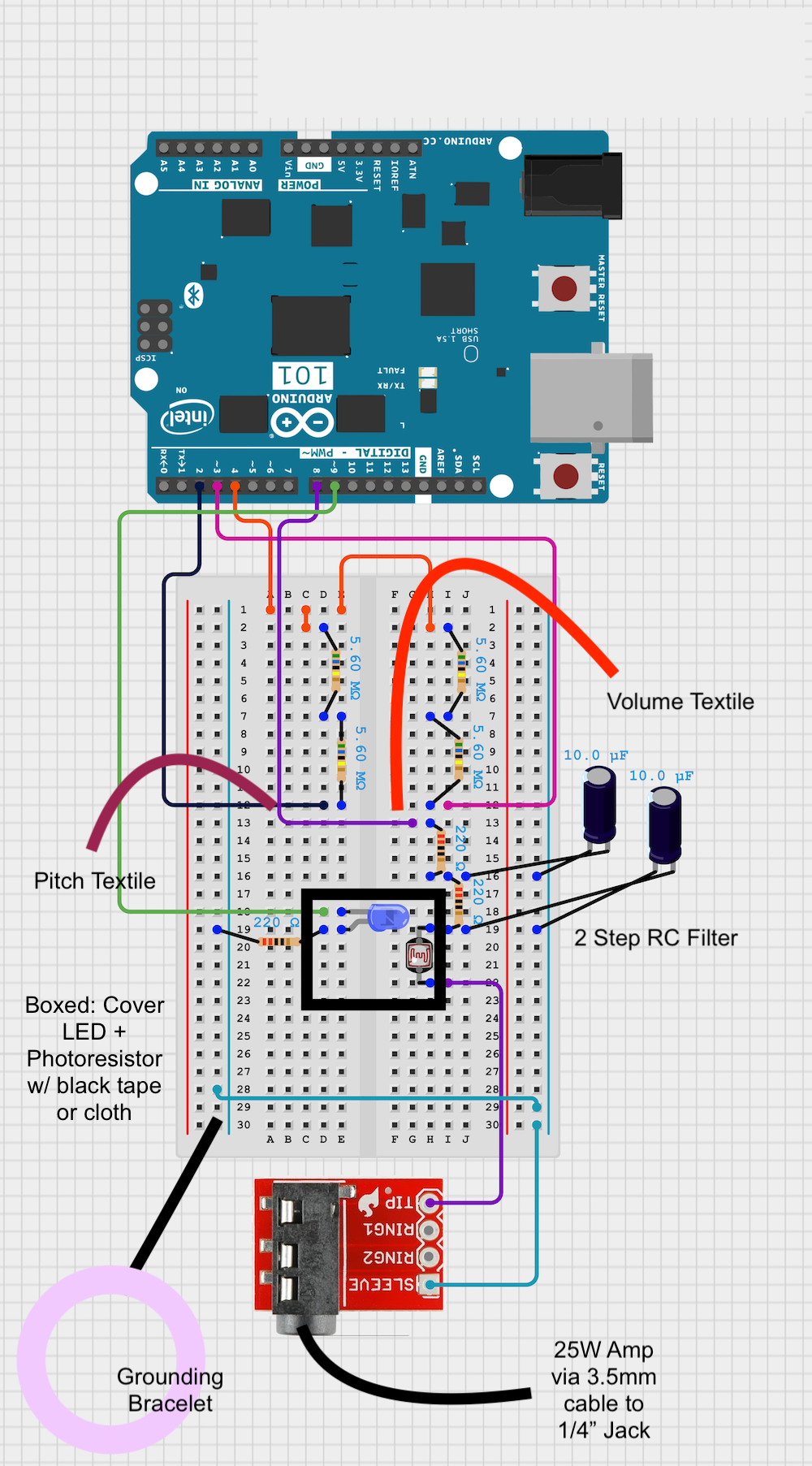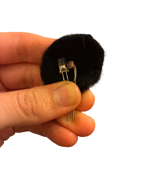 Important part of this is I didn't want the volume to interrupt the pitch signal. This happened with my analog theremin and boy was it a pain. Well, I read that something cool and useful to do was to take an LED and a photoresistor and basically change volume based on the dimming and brightening of the LED as my hand gets closer or farther from the volume textile. This is great because it makes the volume textile reactive while the pitch textile is also reactive but the signals don't gravely interrupt each other.
