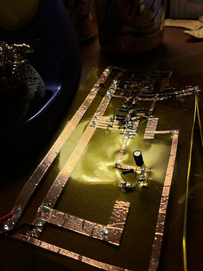 Still, can you believe, adding solder to those joints keeps this circuit unstable. There is inconsistent continuity in the circuit and the solder could ultimately corrode the copper tape. And a theremin circuit is already sensitive as it is.