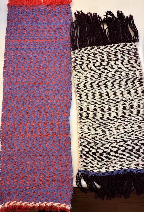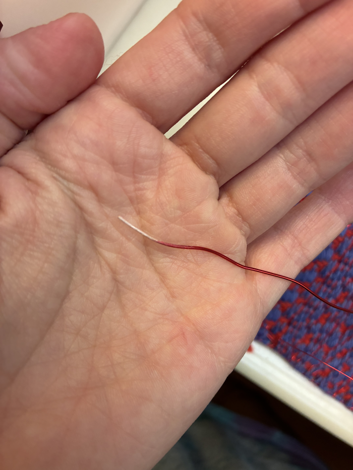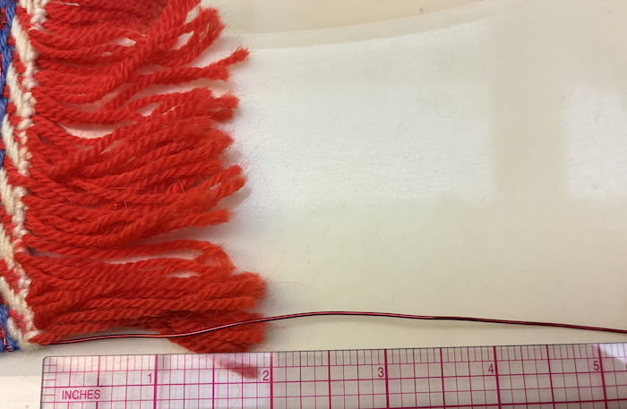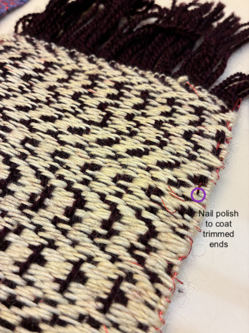 I finished weaving my volume and pitch antennas. By finished I mean I washed them. Yes, I wet finished them. No woven piece is done until it's washed but because my antennas contained enameled copper wire, I had to be extra careful. I washed the antennas by hand in the sink. Remember I have 2 20AWG gauge selvedge copper wires and 2 30AWG gauge copper wire weft tails. I trimmed the weft tails and wove them back into the piece. I trimmed all selvedge wires except for one to connect to the circuit. I wove those tails back into the piece too. I used nail polish I had to coat those trimmed ends to prevent copper wire damage from washing. Given my wool yarns, I used cold water and poured a little bit of mild detergent in the water and swirled the mixture a bit. I just soaked the antennas for about 10 minutes without agitation and put them outside to dry.